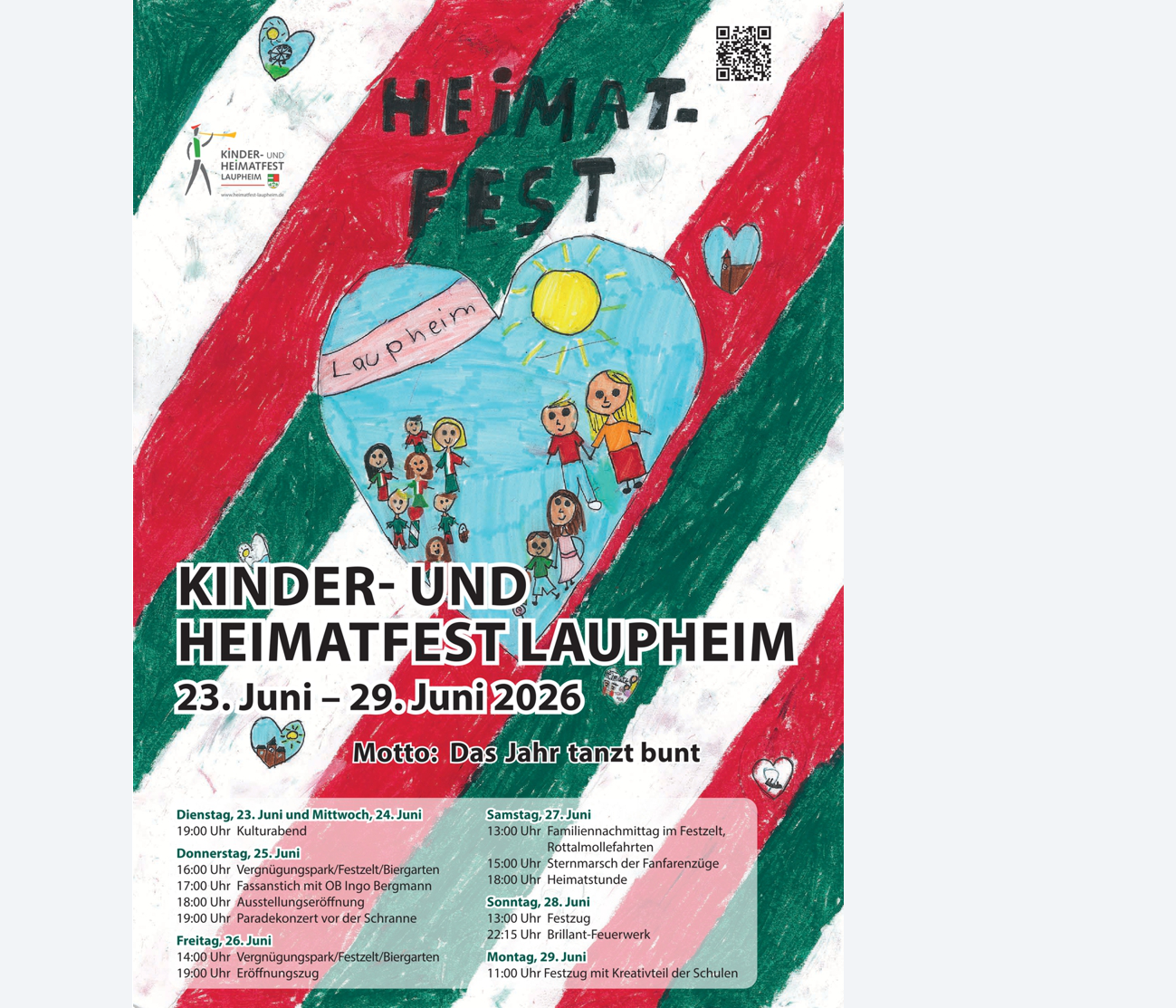 Die Bilder können von 18. Mai bis 12. Juni 2026 bei Frau Buse in Raum 111 im Rathaus Laupheim abgegeben werden. Die drei Gewinner des Malwettbewerbs werden am Kinder- und Familiennachmittag prämiert und dürfen auf weitere Überraschungen gespannt sein.