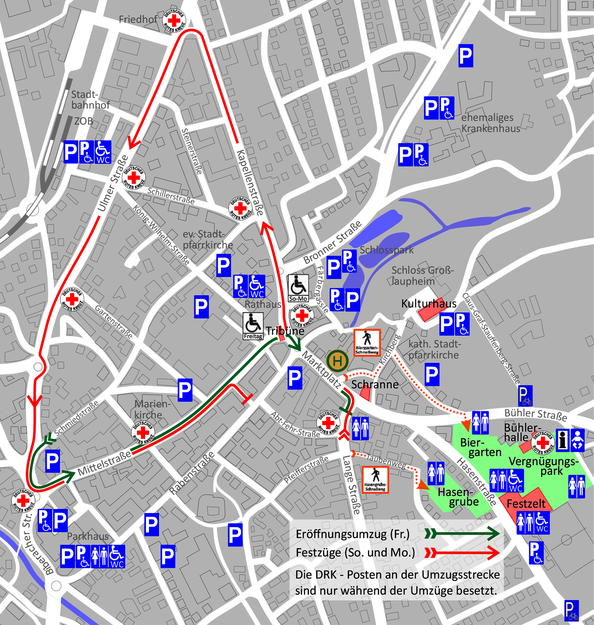 Stadtkapelle: Start um 06:00 Uhr am Probelokal in der Rabenstraße / Im Krautgarten / Herrenmahd / Laubachweg / Pfeifferstraße / Lange Straße / Marktplatz / Kirchberg / Bühlerstraße / Lindenstraße / Erlenweg / Bühlerstraße / Kastanienweg / Zwerchäcker / Zwischen den Wegen / Zwire (Pause mit Frühstück)